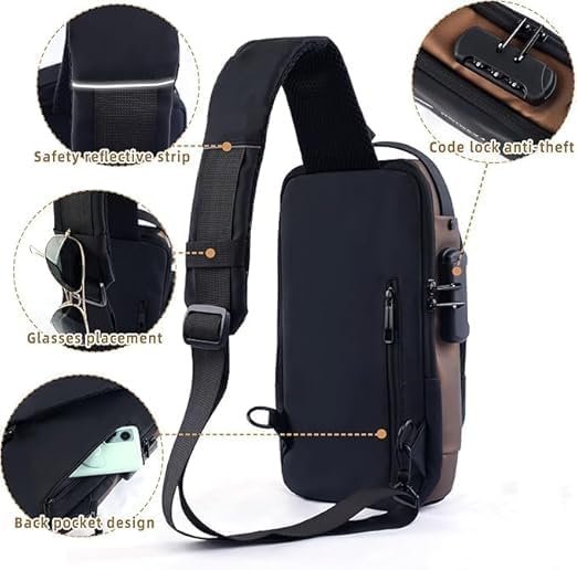 شنطة ظهر كاجوال بحزام وفتحة USB مضادة للسرقة ومقاومة للماء، للارتداء على الصدر والكتف من ماكي ستور، أزرق وبني