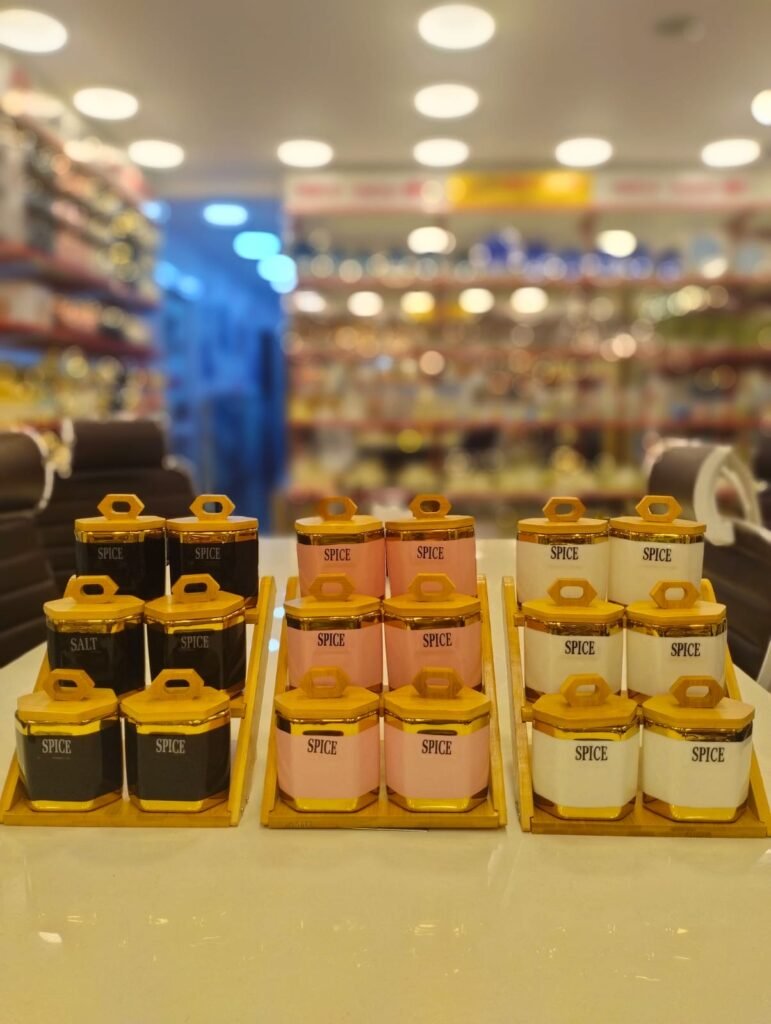 طقم برطمانات توابل دوّار – تصميم خشبي فاخر × غطاء دهبي