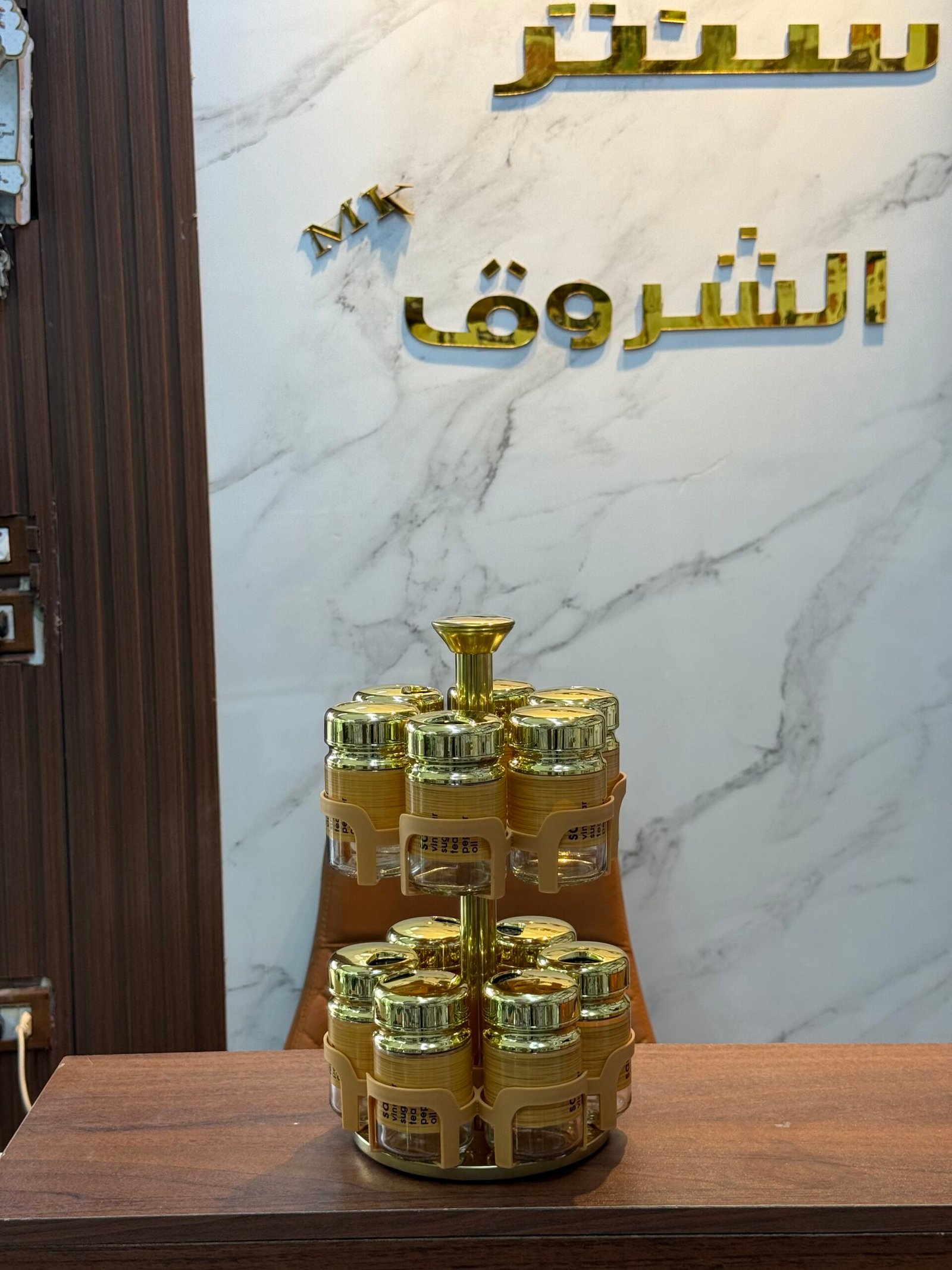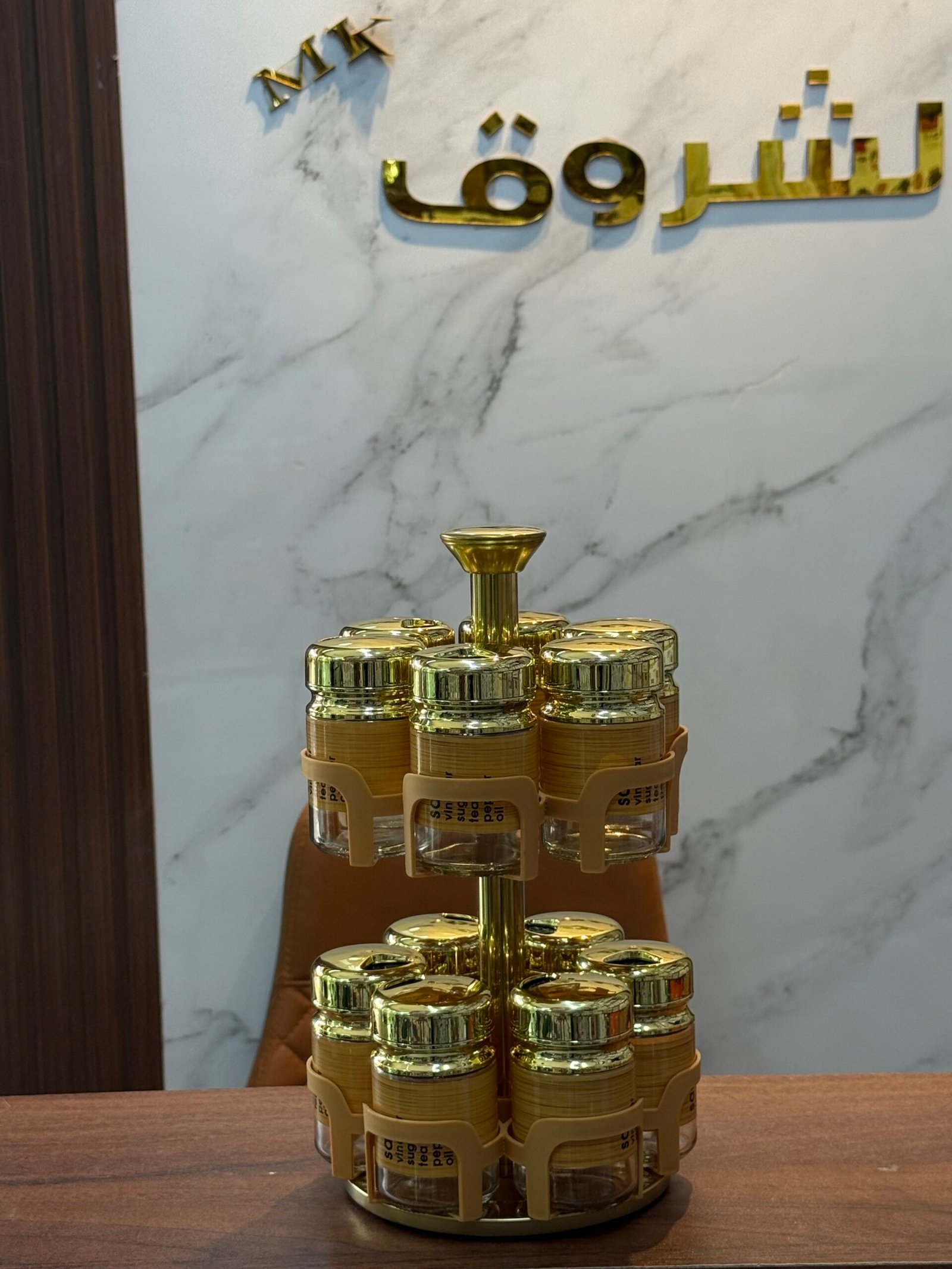 طقم برطمانات توابل دوّار – تصميم خشبي فاخر × غطاء دهبي