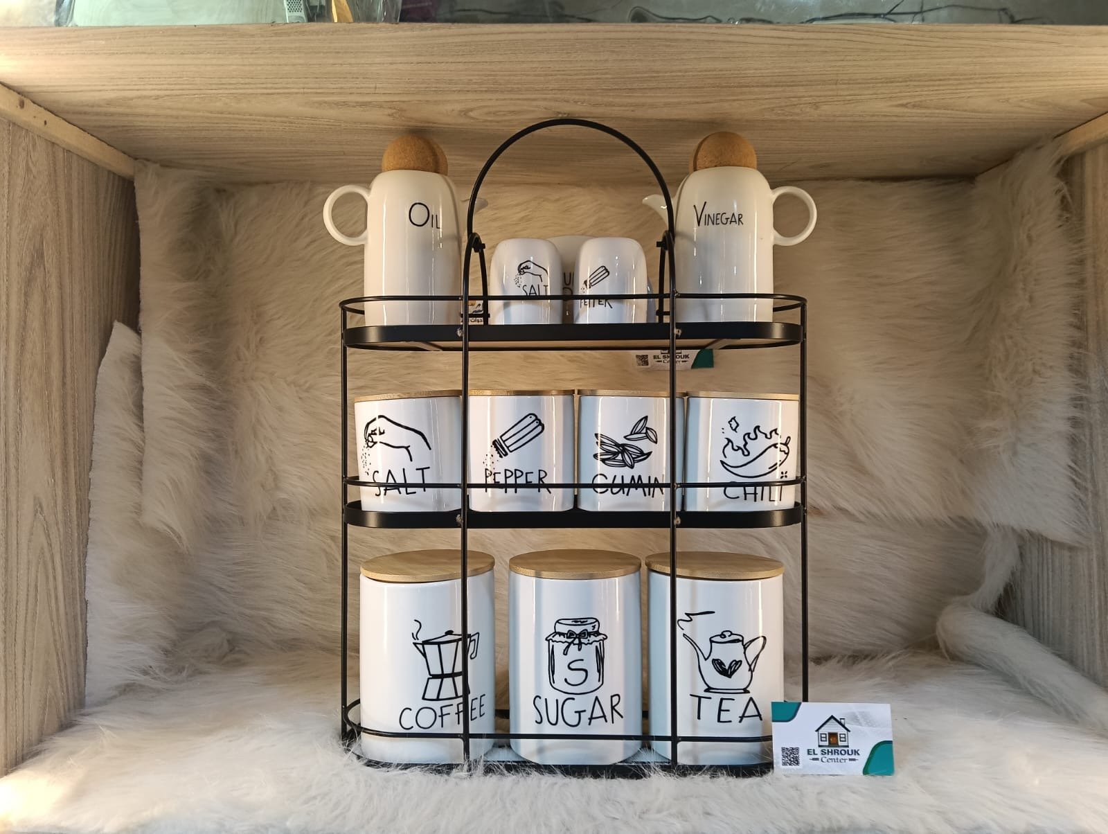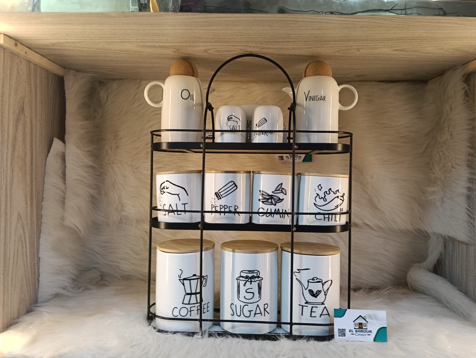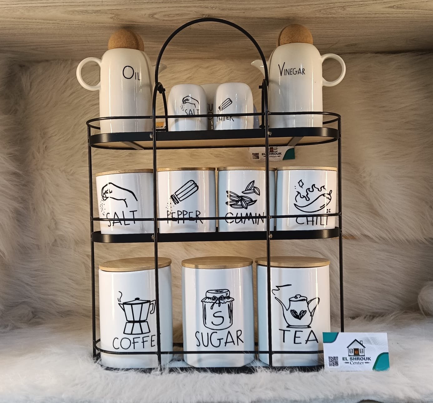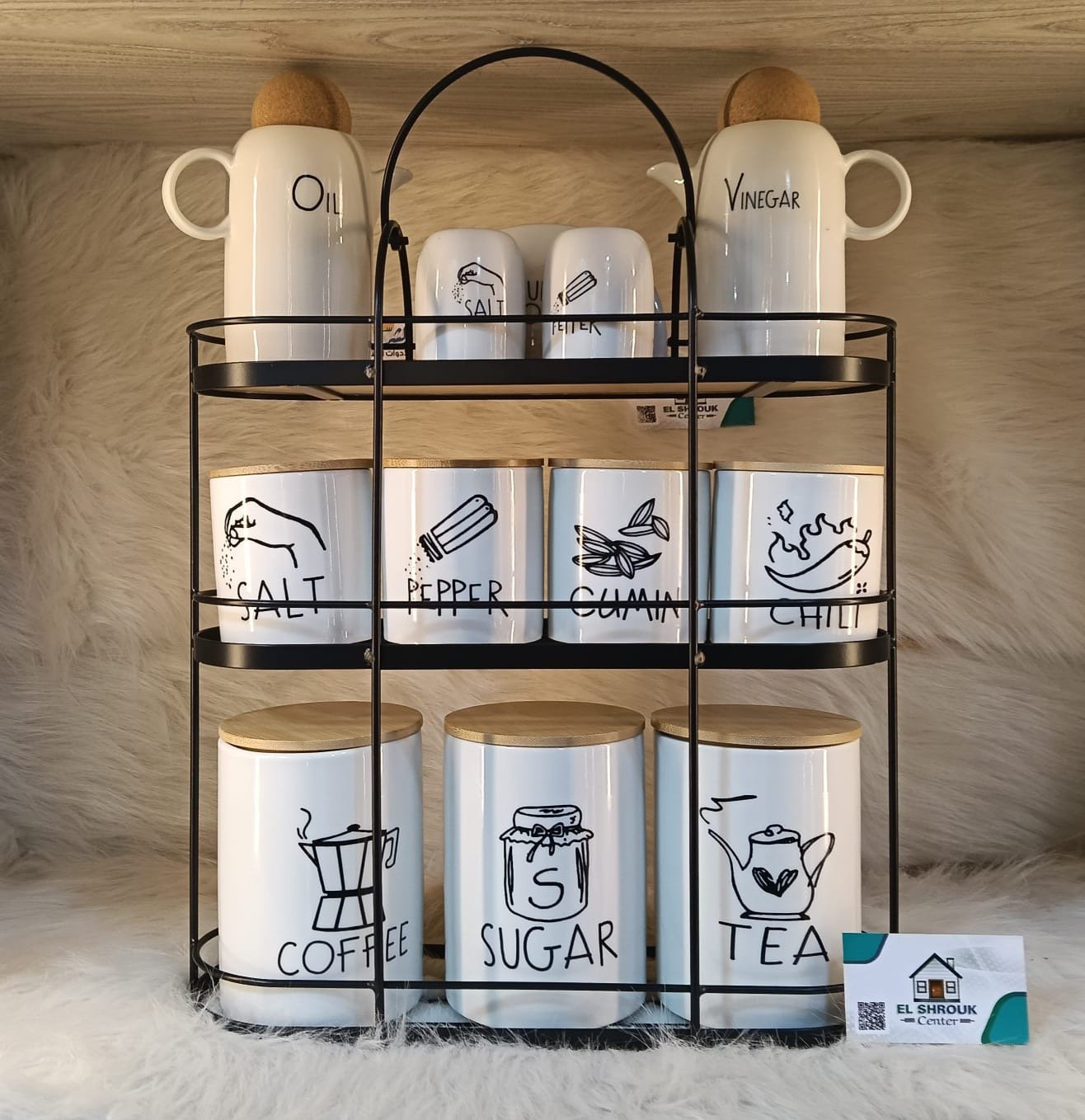 مكون من برطمانات سيراميك بغطا خشب طبيعي + استاند معدني شيك جدًا 🖤