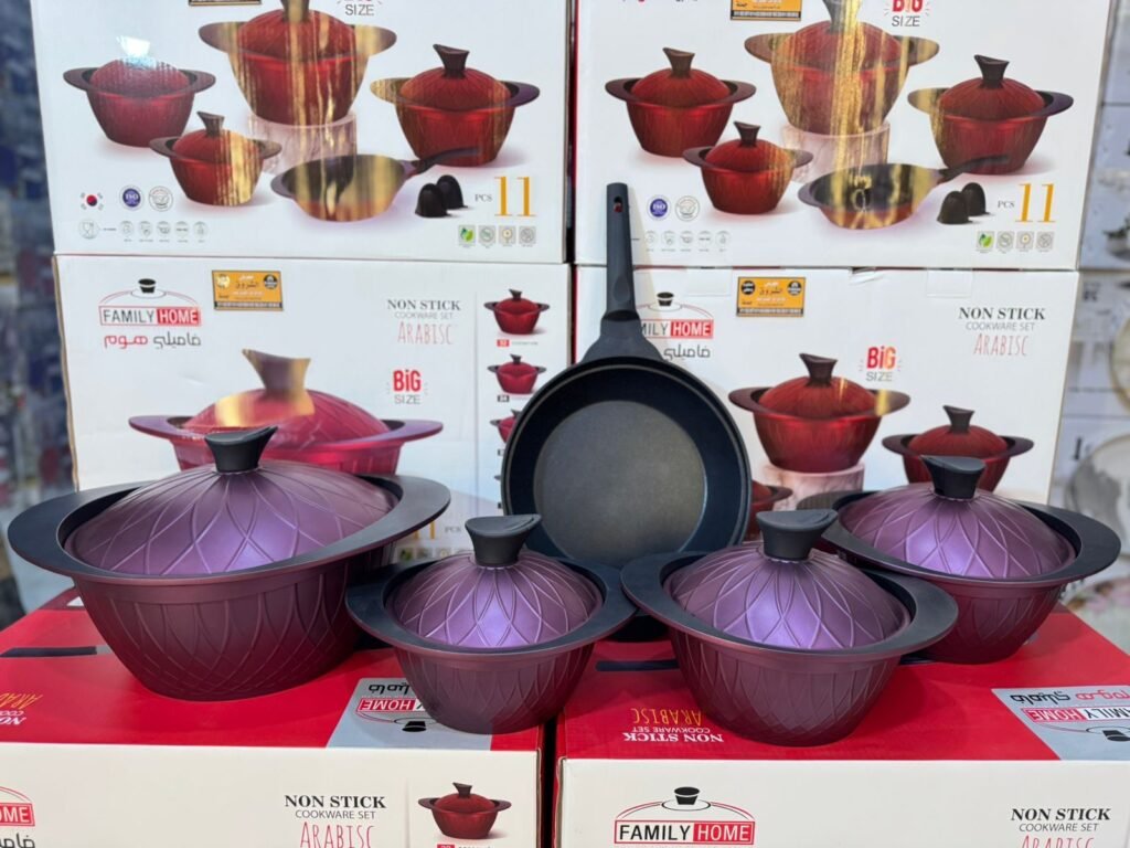 الطقم لونه أحمر غامق فخم، ومناسب لكل أنواع البوتاجازات، وكمان صحي وEco Friendly 🌿
