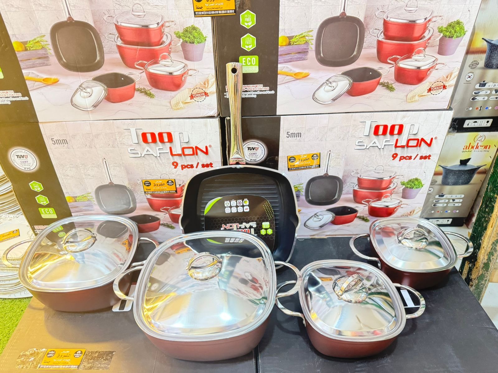طقم حلل Toop Saflon مكون من 9 قطع، خامة قوية جدًا وسُمك 5 مم، ومعاه أغطية استانلس أنيقة.