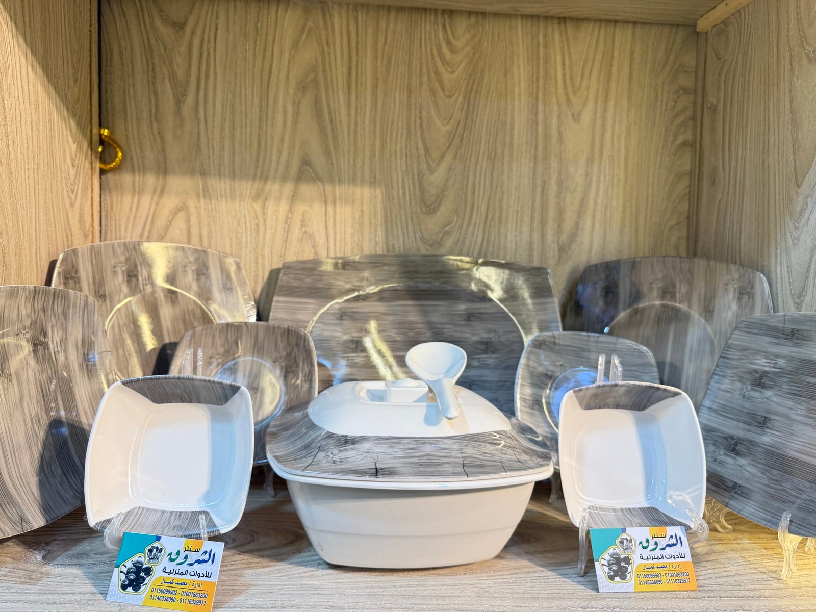 ✨ طقم ملامين ٣٨ قطعة – شكل خشبي مودرن وفخامة على السفرة ✨